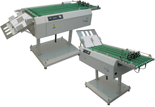 Spedo 8200 Descending StackerThe Spedo 8200 Descending Stacker has been designed to run in-line with the Spedo range of continuous forms cutters. Cut sheets are accepted from the forms cutter and shingled and stacked to produce a neat stack ready for finishing. Using the Spedo cutters boost / batch function, stacks can be taken away quickly with only a minimum delay thus increasing productivity. |
